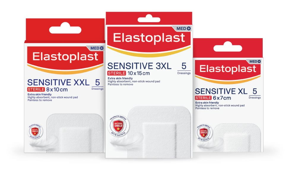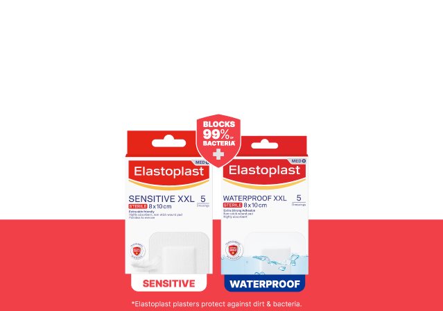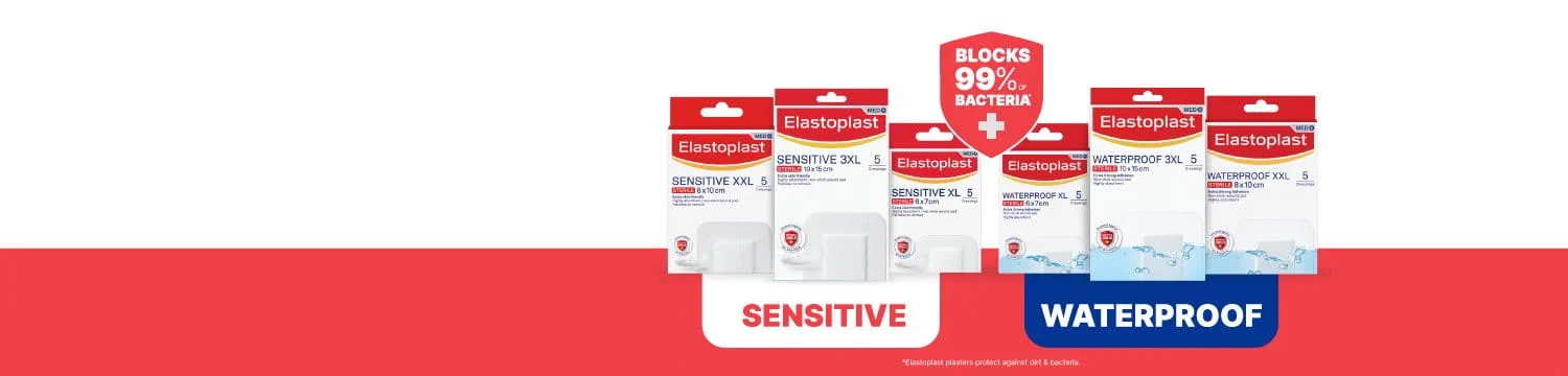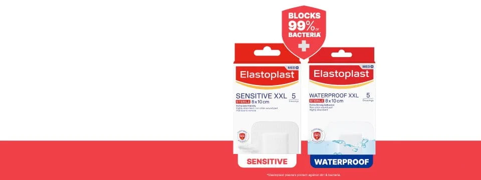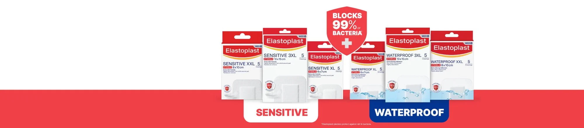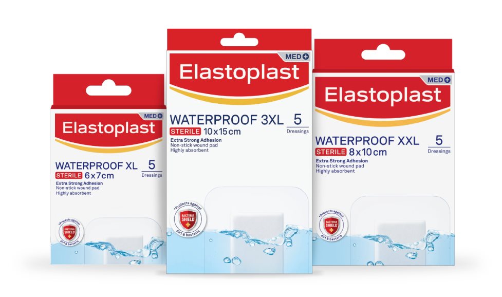 Elastoplast Sterile Waterproof XL, XXL and 3XL wound dressings for waterproof protection of everyday larger or post-operative wounds.